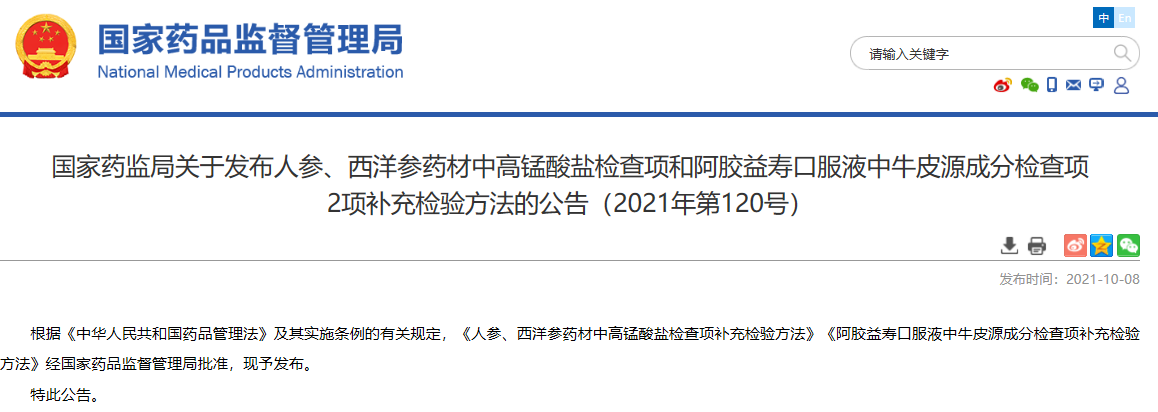 國家藥監(jiān)局關(guān)于發(fā)布人參、西洋參藥材中高錳酸鹽檢查項(xiàng)和阿膠益壽口服液中牛皮源成分檢查項(xiàng)2項(xiàng)補(bǔ)充檢驗(yàn)方法的公告(2021年第120號(hào))