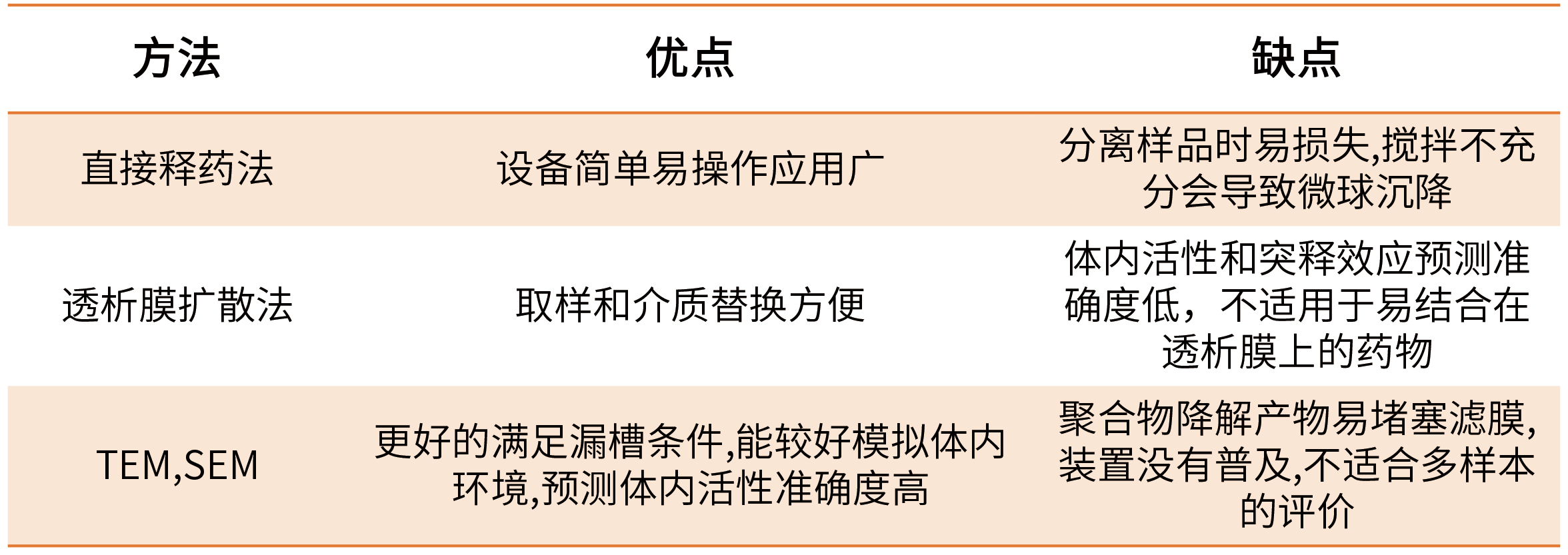 ③ 透析膜擴(kuò)散法,該法是指將微球放入透析管中,并將其放入介質(zhì)中測(cè)定。3種方法優(yōu)缺點(diǎn)比較見表2。