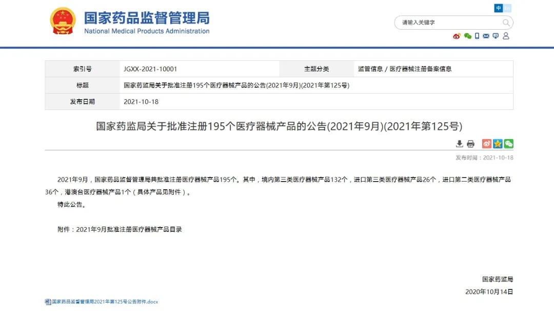 國家藥監(jiān)局關(guān)于批準注冊195個醫(yī)療器械產(chǎn)品的公告(2021年9月)(2021年第125號)