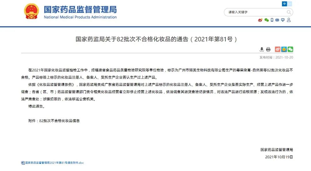 國家藥監(jiān)局關(guān)于82批次不合格化妝品的通告(2021年第81號)