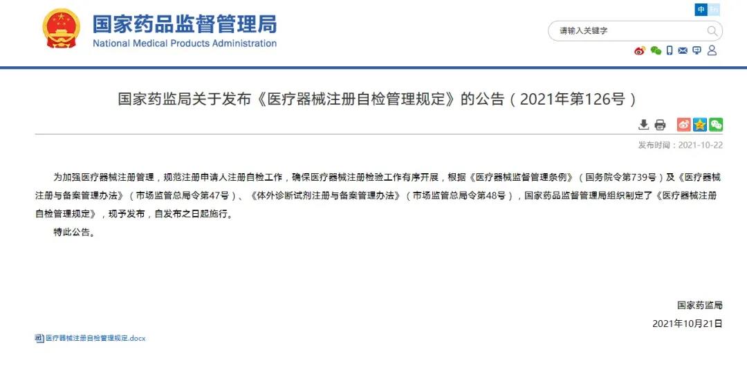 國家藥監(jiān)局關(guān)于發(fā)布《醫(yī)療器械注冊自檢管理規(guī)定》的公告(2021年第126號)