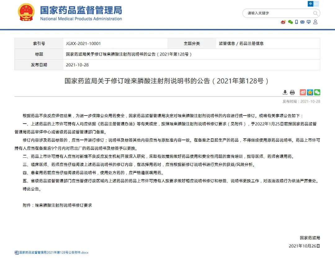 國家藥監(jiān)局關(guān)于修訂唑來膦酸注射劑說明書的公告(2021年第128號)