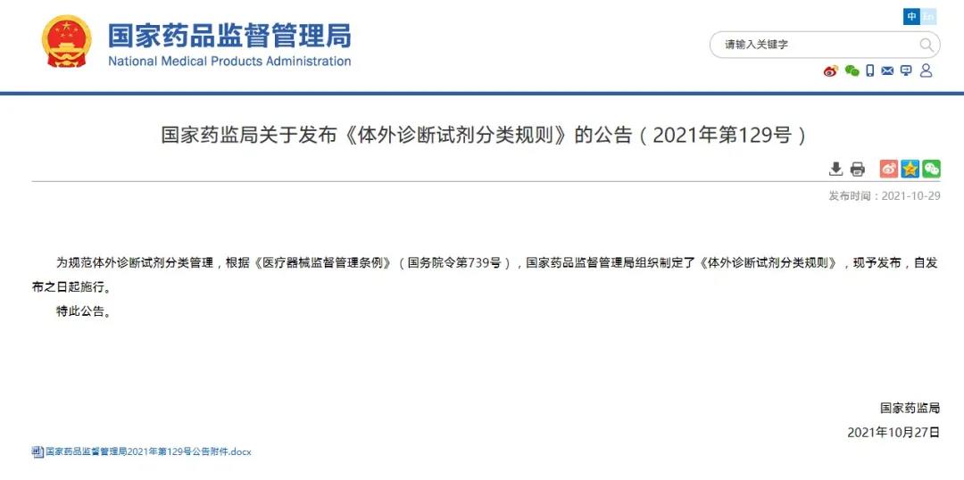 國家藥監(jiān)局關(guān)于發(fā)布《體外診斷試劑分類規(guī)則》的公告(2021年第129號)