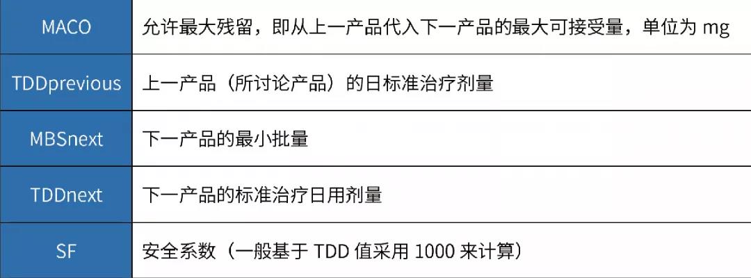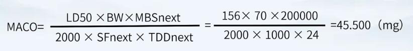 例如,就原料藥而言,通用限度為100ppm時(shí),MACO為最小批量(MBS)的0.01%;通用限度為10ppm時(shí),MACO為最小批量(MBS)的0.001%。