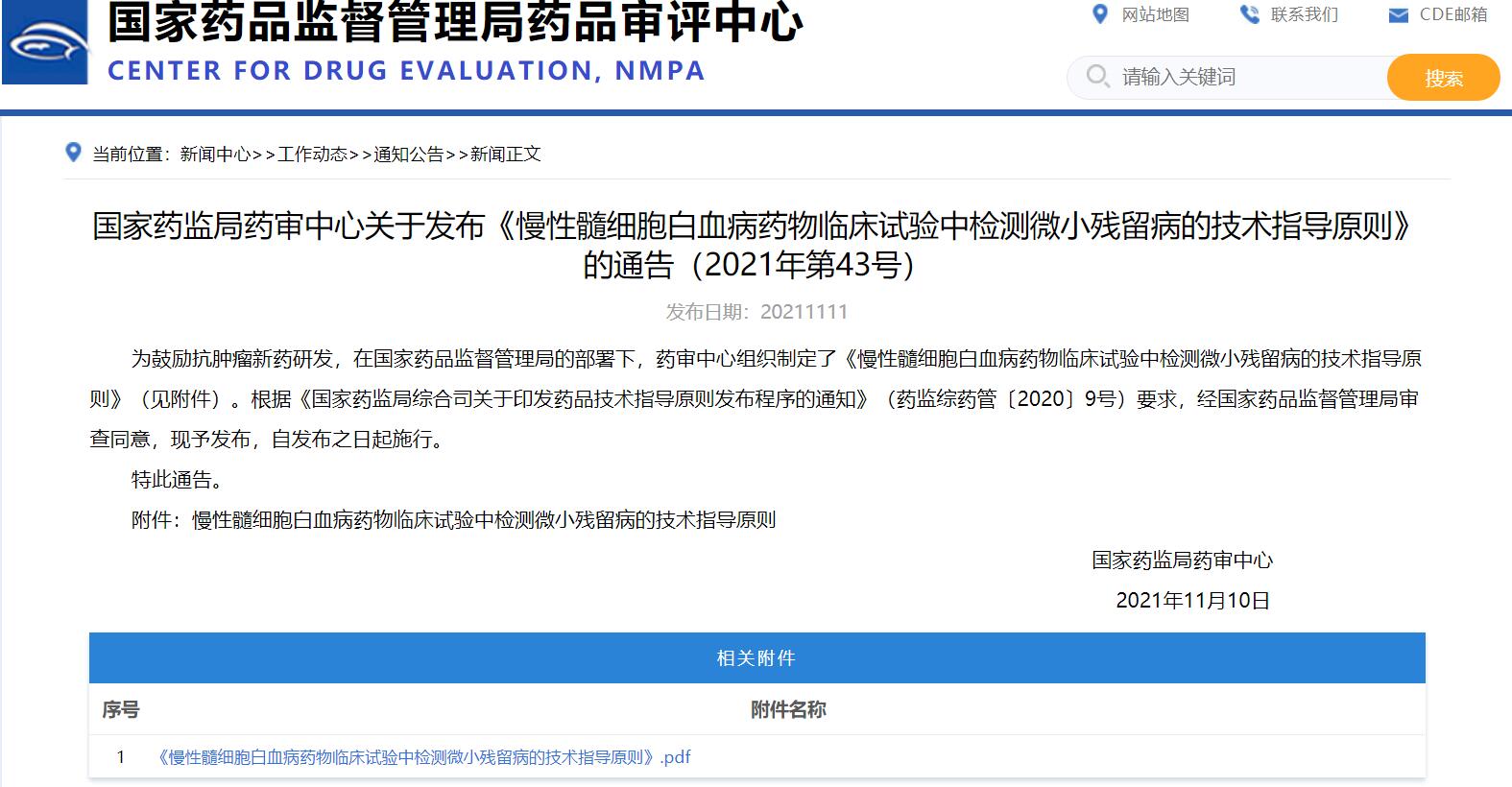 國家藥監(jiān)局藥審中心關(guān)于發(fā)布《慢性髓細(xì)胞白血病藥物臨床試驗中檢測微小殘留病的技術(shù)指導(dǎo)原則》的通告