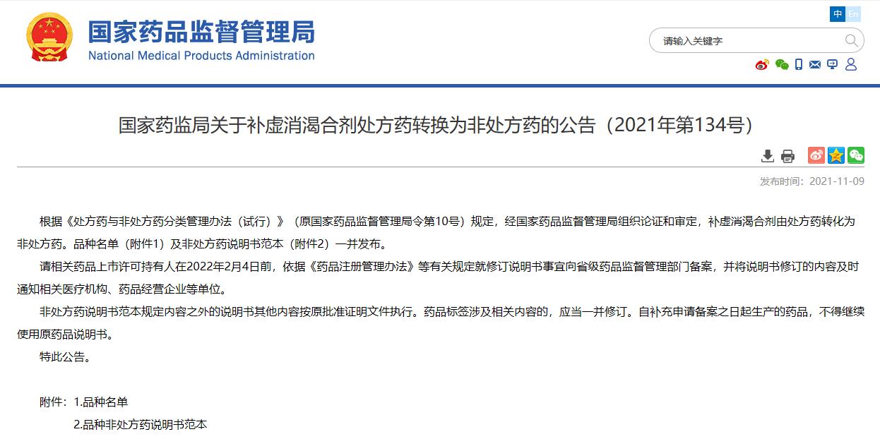 國家藥監(jiān)局關(guān)于補(bǔ)虛消渴合劑處方藥轉(zhuǎn)換為非處方藥的公告(2021年第134號)