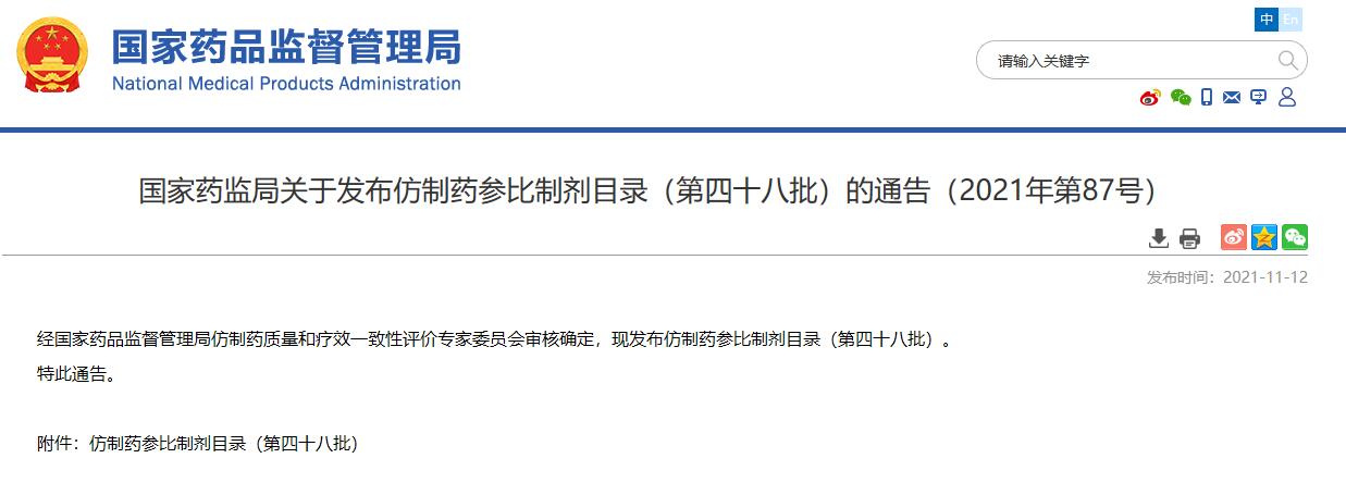 國家藥監(jiān)局關(guān)于發(fā)布仿制藥參比制劑目錄(第四十八批)的通告(2021年第87號)