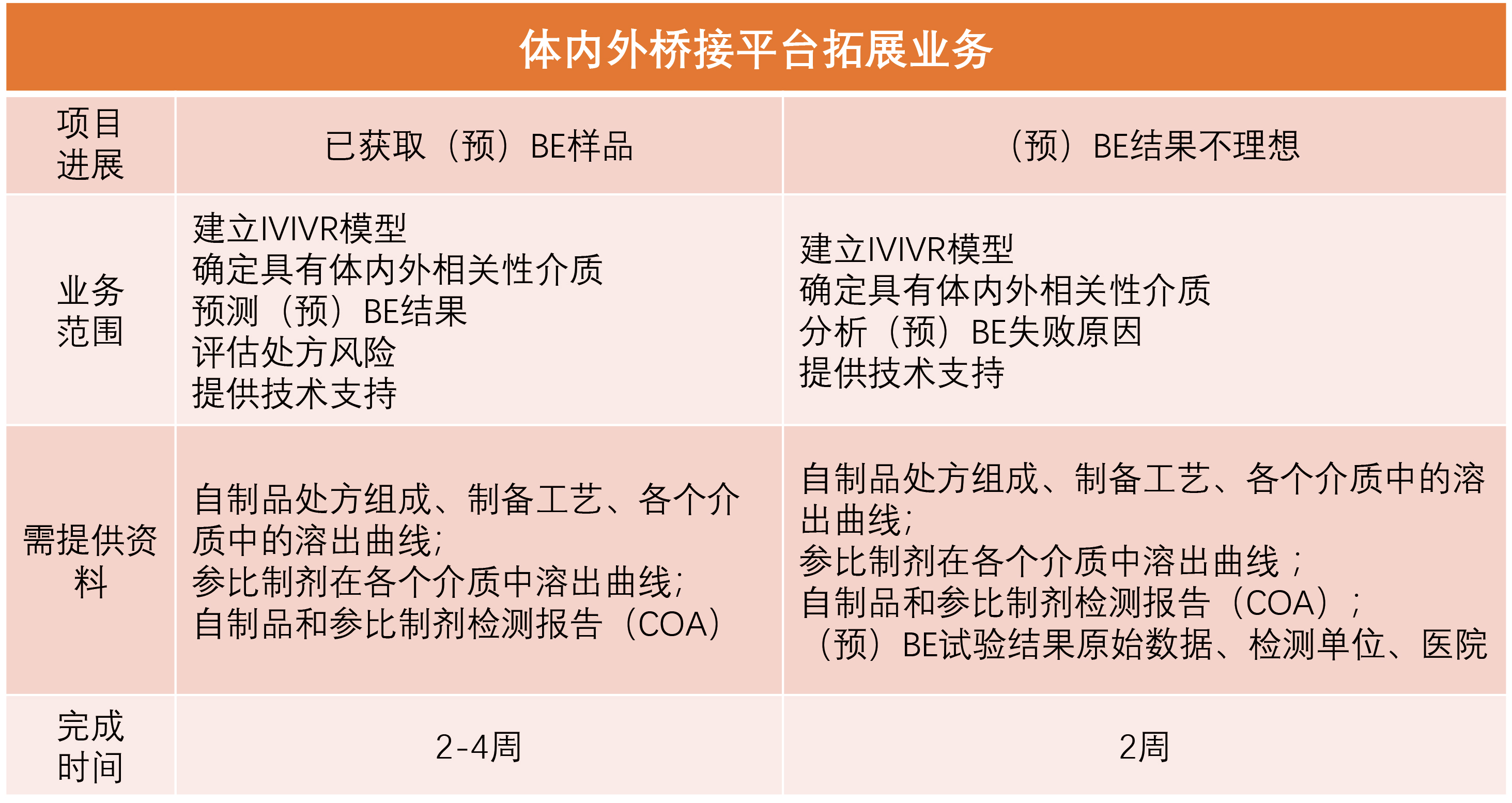 公司體內(nèi)外橋接(IVIVR)平臺作為國內(nèi)首家IVIVR平臺,已被納入中關(guān)村高精尖產(chǎn)業(yè)協(xié)同創(chuàng)新平臺體系。該平臺實現(xiàn)了體外藥學(xué)和體內(nèi)藥動學(xué)的科學(xué)橋接:利用體內(nèi)外相關(guān)性模型技術(shù),使用體外溶出數(shù)據(jù)預(yù)測藥物在體內(nèi)吸收情況??擅鞔_項目在開發(fā)過程中的藥學(xué)目標(biāo),提高仿制藥的生物等效性試驗(BE試驗)的成功率,縮短藥物的研發(fā)時間,節(jié)約產(chǎn)品開發(fā)成本。