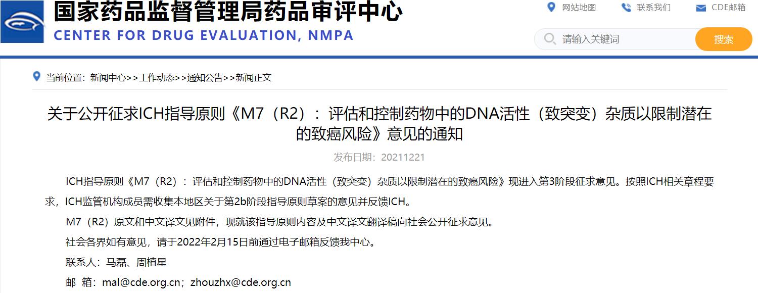 關(guān)于公開征求ICH指導(dǎo)原則《M7(R2):評估和控制藥物中的DNA活性(致突變)雜質(zhì)以限制潛在的致癌風(fēng)險》意見的通知