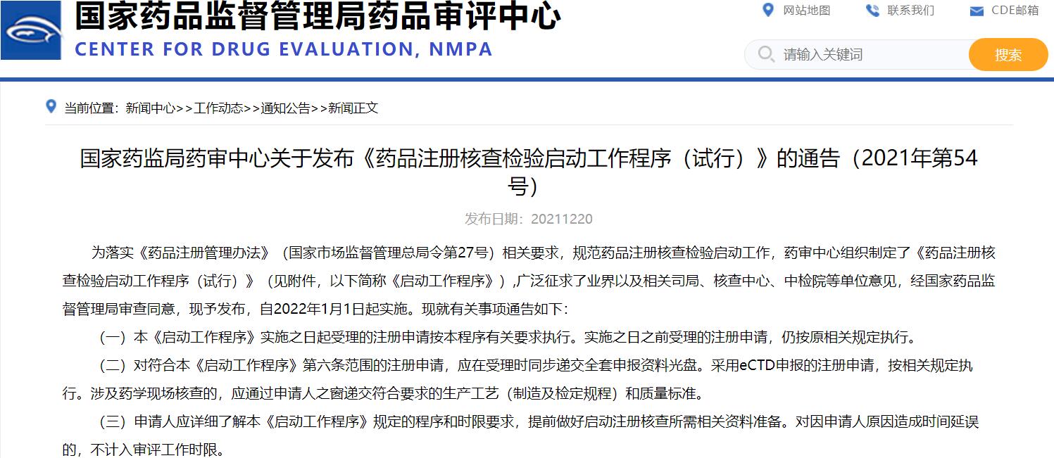 國家藥監(jiān)局藥審中心關(guān)于發(fā)布《藥品注冊核查檢驗啟動工作程序(試行)》的通告(2021年第54號)