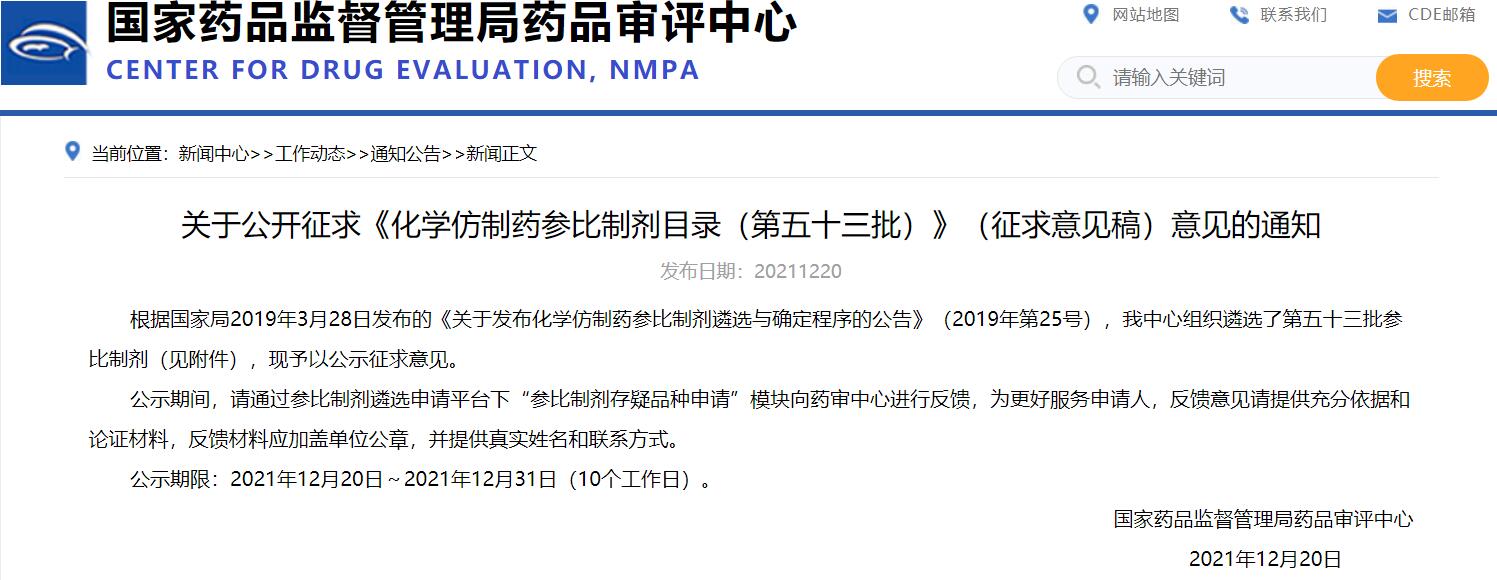 關(guān)于公開征求《化學(xué)仿制藥參比制劑目錄(第五十三批)》(征求意見稿)意見的通知