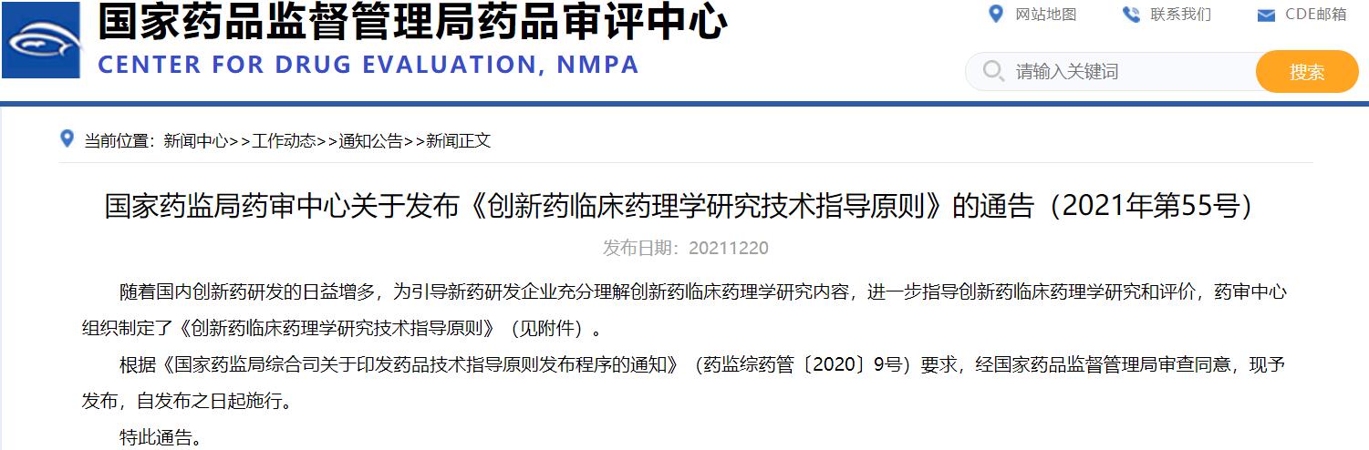 國家藥監(jiān)局藥審中心關(guān)于發(fā)布《創(chuàng)新藥臨床藥理學(xué)研究技術(shù)指導(dǎo)原則》的通告(2021年第55號)