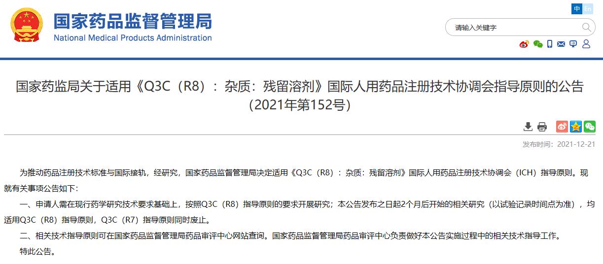 國家藥監(jiān)局關(guān)于適用《Q3C(R8):雜質(zhì):殘留溶劑》國際人用藥品注冊技術(shù)協(xié)調(diào)會指導(dǎo)原則的公告(2021年第152號)