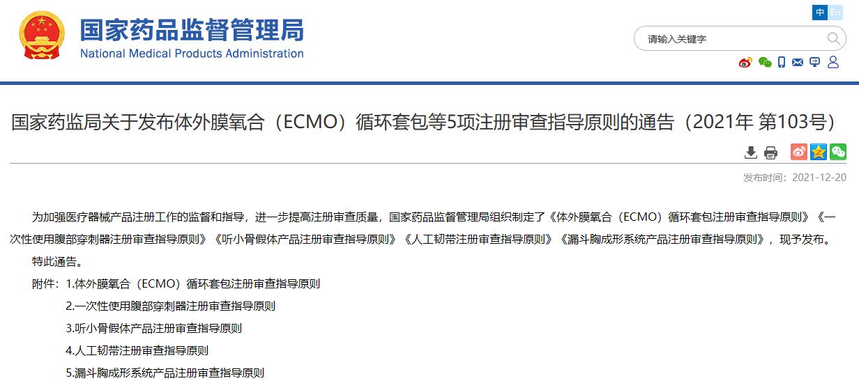 國家藥監(jiān)局關(guān)于發(fā)布體外膜氧合(ECMO)循環(huán)套包等5項注冊審查指導(dǎo)原則的通告(2021年 第103號)