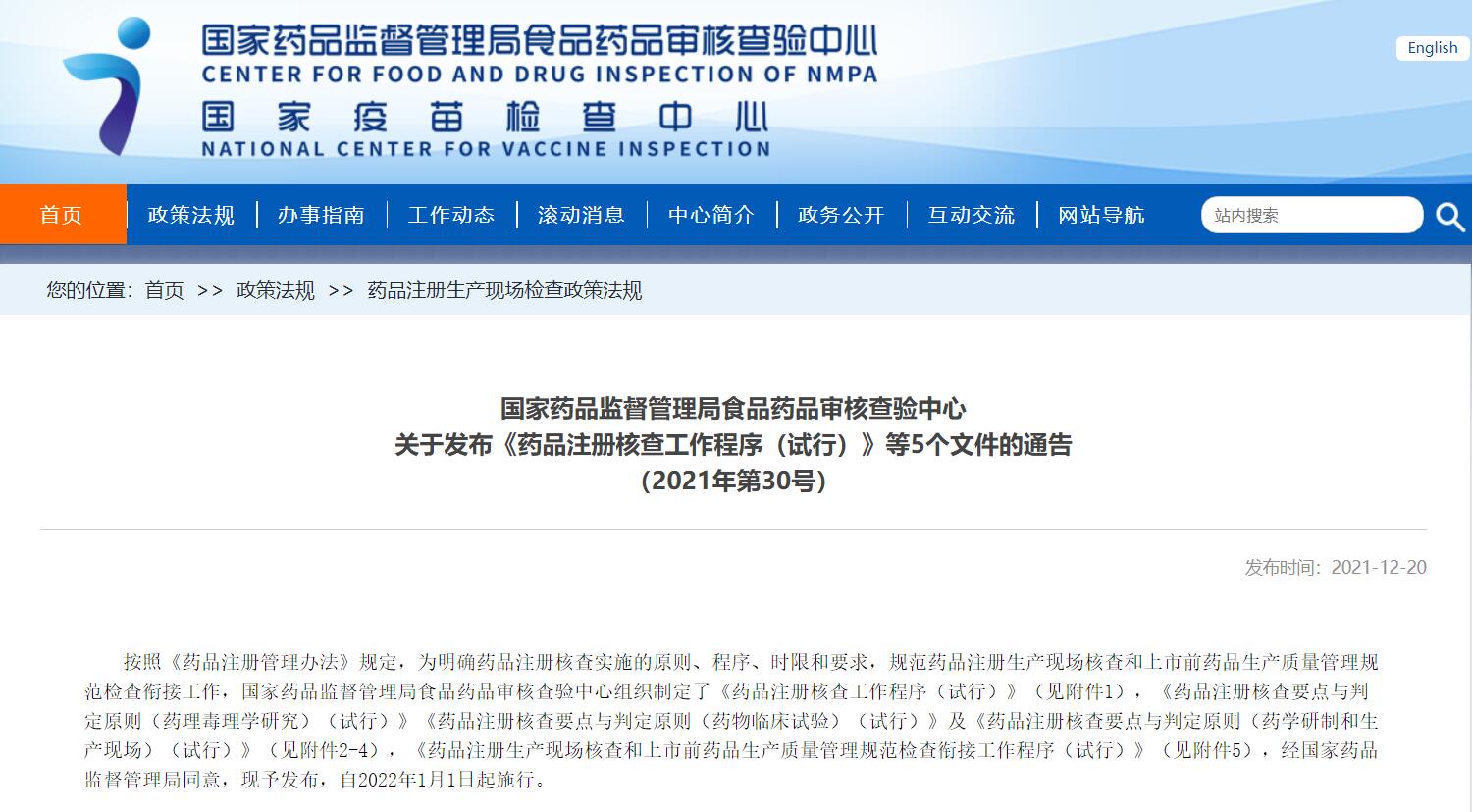 國家藥品監(jiān)督管理局食品藥品審核查驗中心關(guān)于發(fā)布《藥品注冊核查工作程序(試行)》等5個文件的通告(2021年第30號)