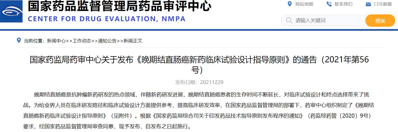 國家藥監(jiān)局藥審中心關(guān)于發(fā)布《晚期結(jié)直腸癌新藥臨床試驗設(shè)計指導(dǎo)原則》的通告(2021年第56號)