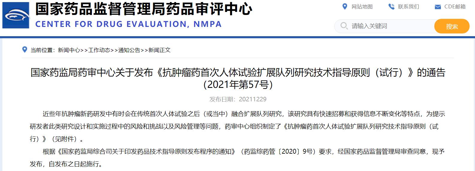 國家藥監(jiān)局藥審中心關(guān)于發(fā)布《抗腫瘤藥首次人體試驗擴展隊列研究技術(shù)指導(dǎo)原則(試行)》的通告(2021年第57號)
