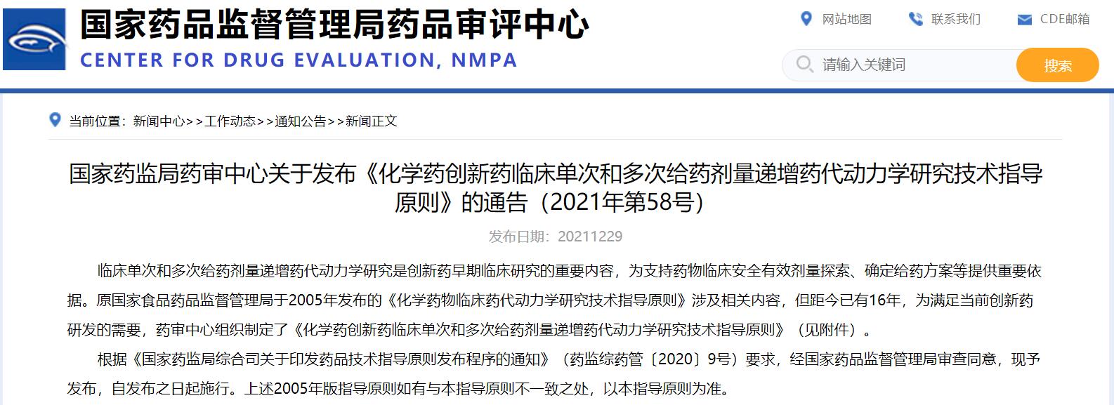 國家藥監(jiān)局藥審中心關(guān)于發(fā)布《化學(xué)藥創(chuàng)新藥臨床單次和多次給藥劑量遞增藥代動力學(xué)研究技術(shù)指導(dǎo)原則》的通告(2021年第58號)