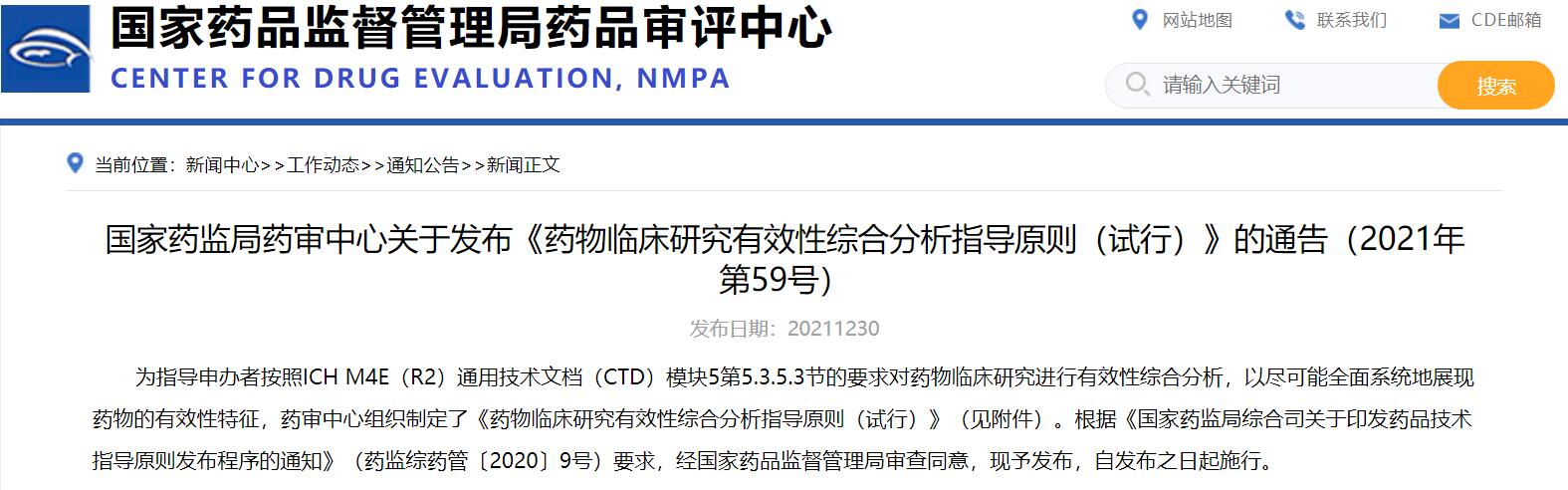 國家藥監(jiān)局藥審中心關(guān)于發(fā)布《藥物臨床研究有效性綜合分析指導(dǎo)原則(試行)》的通告(2021年第59號)