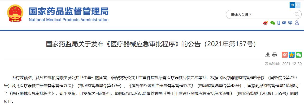 國家藥監(jiān)局關(guān)于發(fā)布《醫(yī)療器械應(yīng)急審批程序》的公告(2021年第157號)