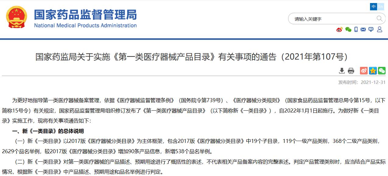 國家藥監(jiān)局關(guān)于實施《第一類醫(yī)療器械產(chǎn)品目錄》有關(guān)事項的通告(2021年第107號)