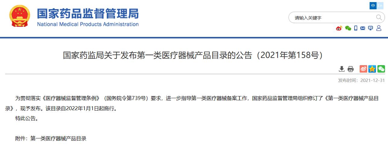 國家藥監(jiān)局關(guān)于發(fā)布第一類醫(yī)療器械產(chǎn)品目錄的公告(2021年第158號)
