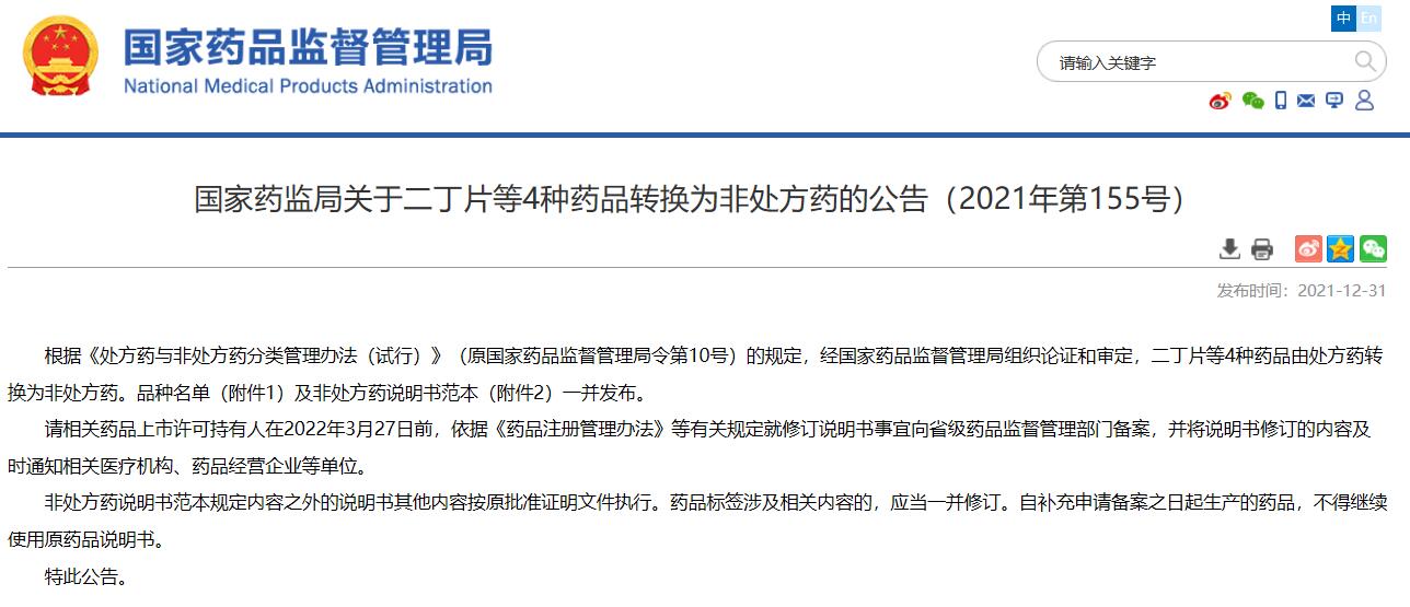 國家藥監(jiān)局關(guān)于二丁片等4種藥品轉(zhuǎn)換為非處方藥的公告(2021年第155號)