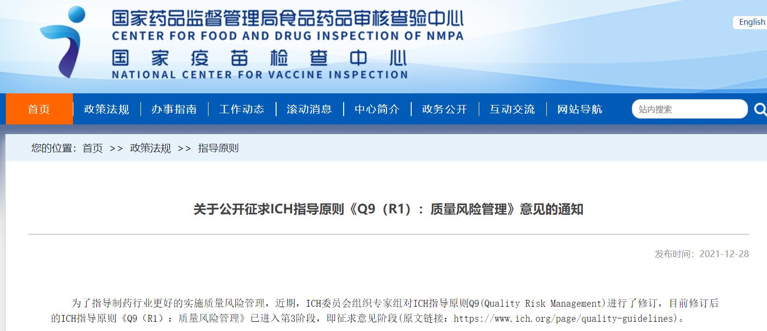 關(guān)于公開征求ICH指導(dǎo)原則《Q9(R1):質(zhì)量風(fēng)險管理》意見的通知