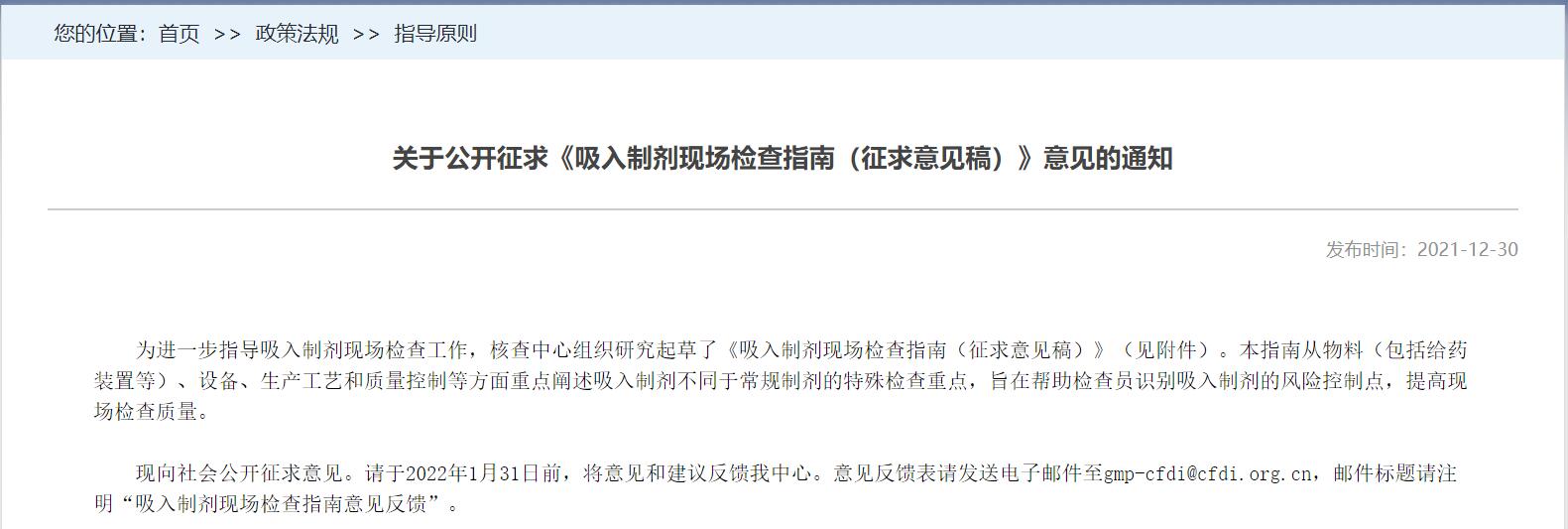 關(guān)于公開征求《吸入制劑現(xiàn)場檢查指南(征求意見稿)》意見的通知
