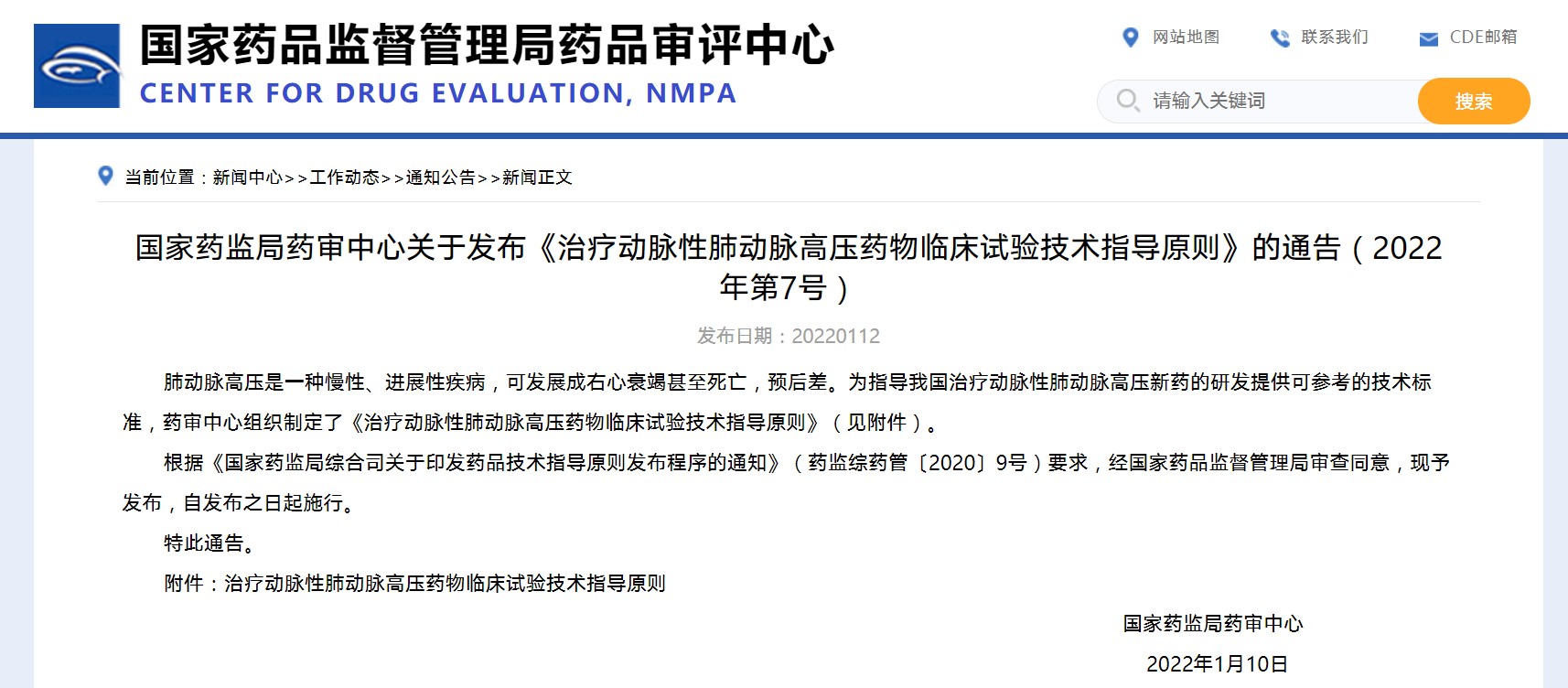 國家藥監(jiān)局藥審中心關(guān)于發(fā)布《治療動(dòng)脈性肺動(dòng)脈高壓藥物臨床試驗(yàn)技術(shù)指導(dǎo)原則》的通告(2022年第7號(hào))