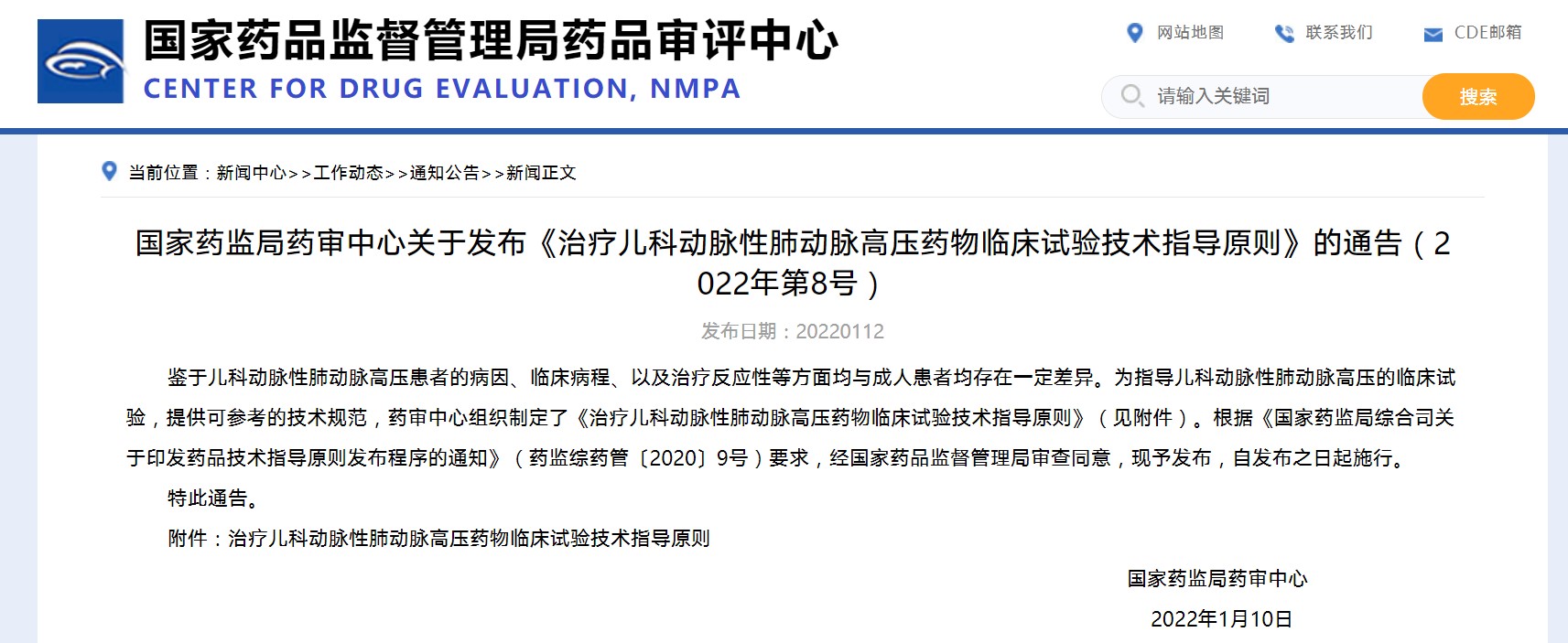 國家藥監(jiān)局藥審中心關(guān)于發(fā)布《治療兒科動(dòng)脈性肺動(dòng)脈高壓藥物臨床試驗(yàn)技術(shù)指導(dǎo)原則》的通告(2022年第8號(hào))