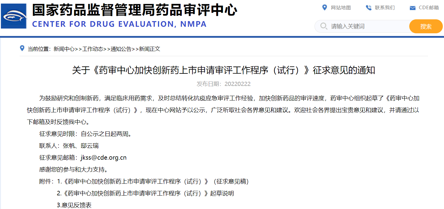 關(guān)于《藥審中心加快創(chuàng)新藥上市申請審評工作程序(試行)》征求意見的通知