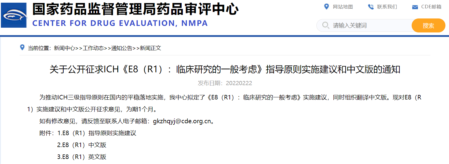 關(guān)于公開征求ICH《E8(R1):臨床研究的一般考慮》指導(dǎo)原則實(shí)施建議和中文版的通知
