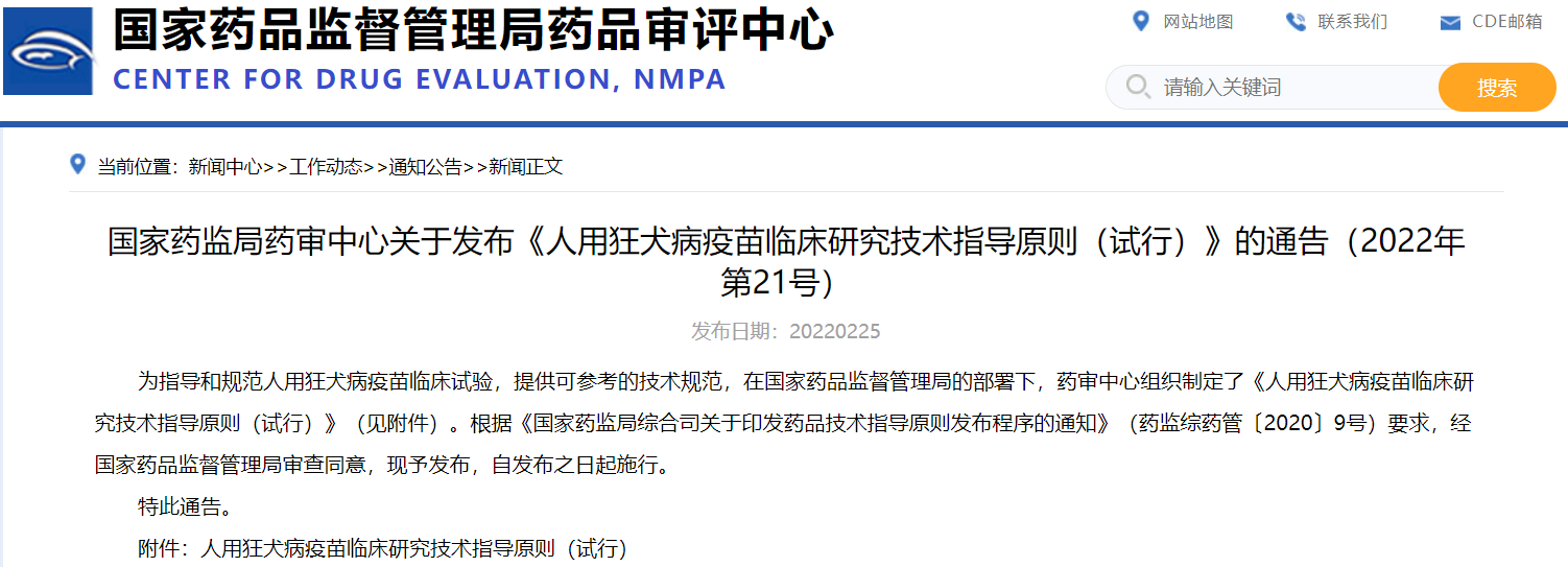 國家藥監(jiān)局藥審中心關(guān)于發(fā)布《人用狂犬病疫苗臨床研究技術(shù)指導(dǎo)原則(試行)》的通告(2022年第21號)
