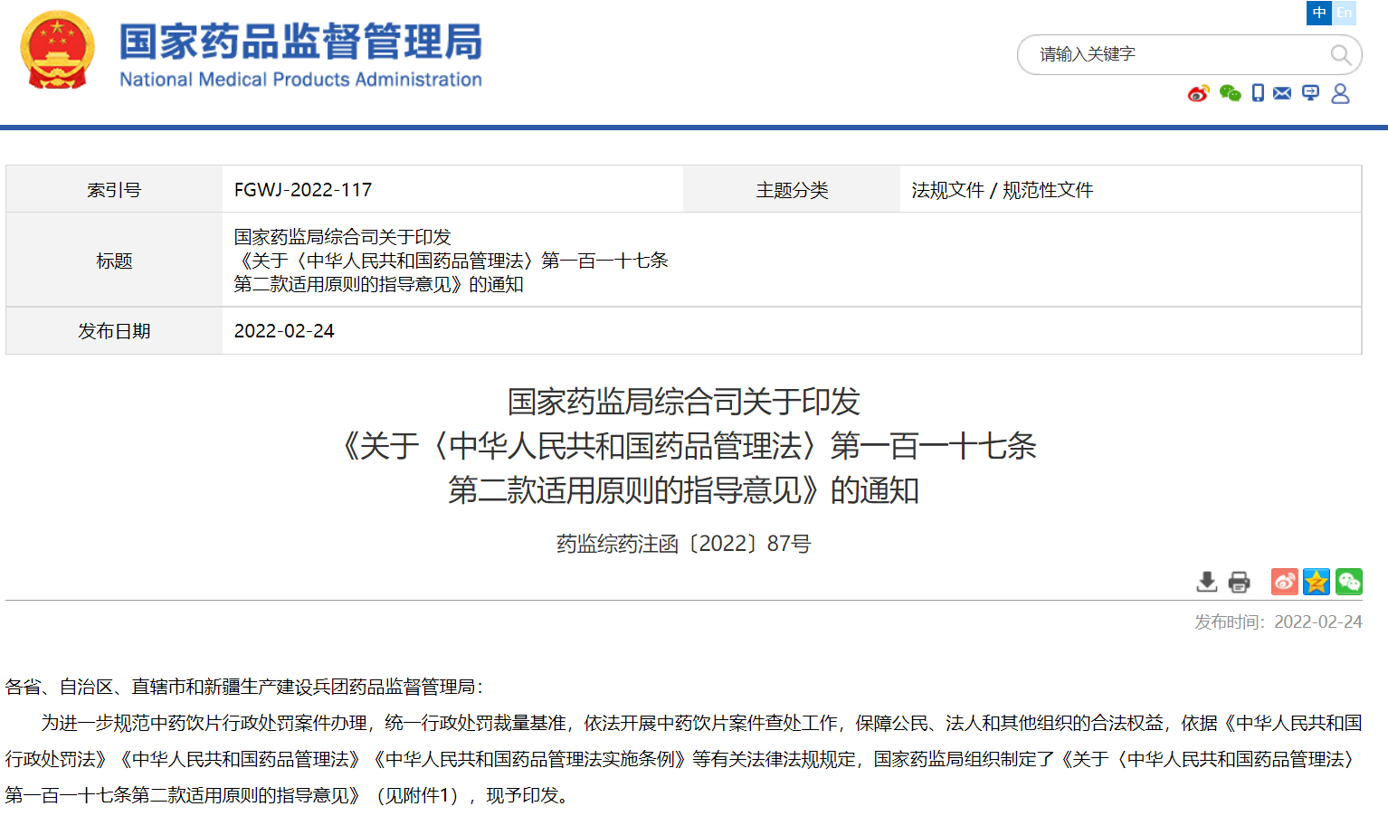 國家藥監(jiān)局綜合司關(guān)于印發(fā) 《關(guān)于〈中華人民共和國藥品管理法〉第一百一十七條 第二款適用原則的指導(dǎo)意見》的通知