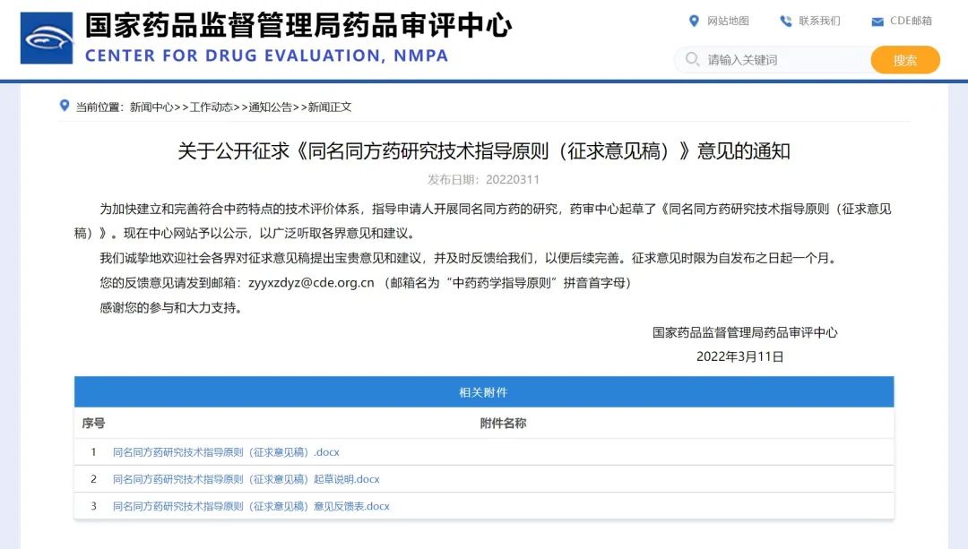 關于公開征求《同名同方藥研究技術指導原則(征求意見稿)》意見的通知