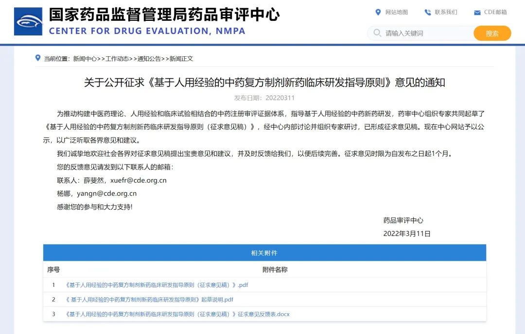 關于公開征求《基于人用經(jīng)驗的中藥復方制劑新藥臨床研發(fā)指導原則》意見的通知