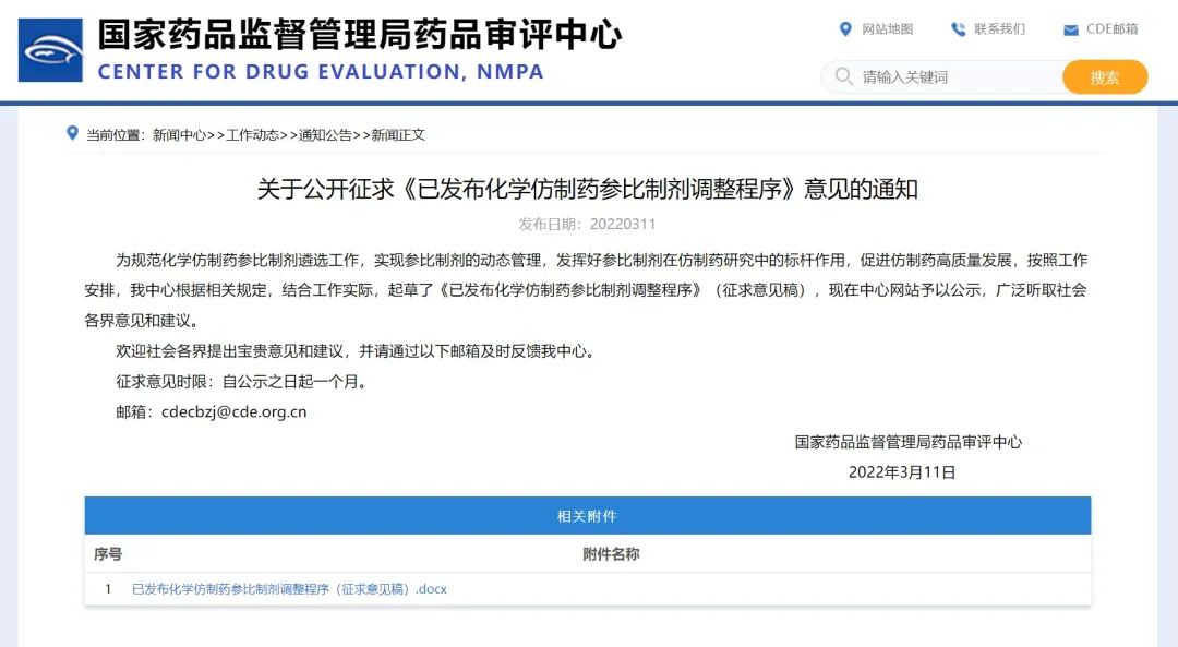 關于公開征求《已發(fā)布化學仿制藥參比制劑調(diào)整程序》意見的通知