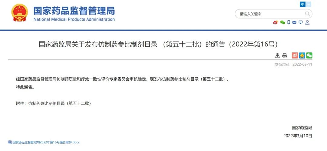 國家藥監(jiān)局關于發(fā)布仿制藥參比制劑目錄 (第五十二批)的通告(2022年第16號)