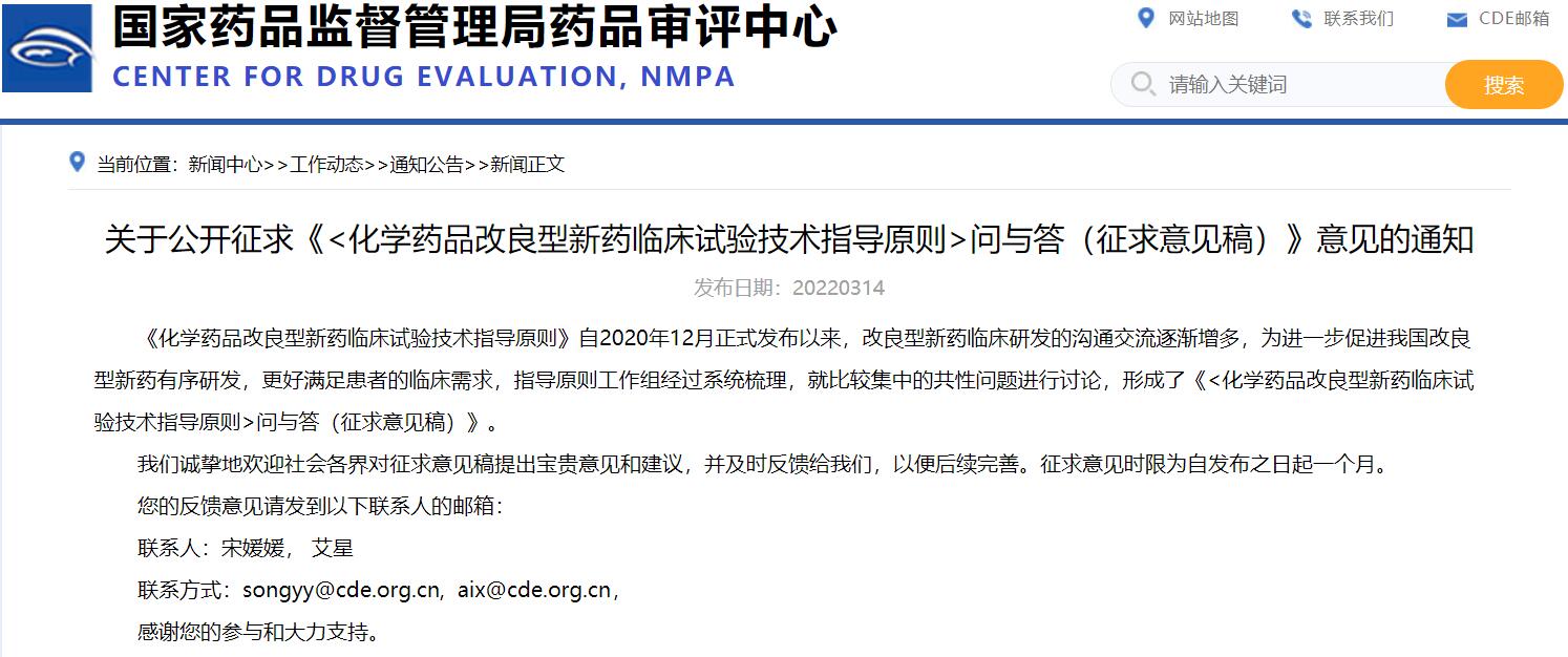 關(guān)于公開征求《<化學(xué)藥品改良型新藥臨床試驗(yàn)技術(shù)指導(dǎo)原則>問(wèn)與答(征求意見(jiàn)稿)》意見(jiàn)的通知