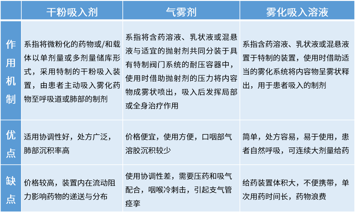 與傳統(tǒng)劑型不同,大多數(shù)經(jīng)口吸入制劑被設(shè)計(jì)為局部作用于肺部,主要有霧化吸入劑(nebulizer,也稱噴霧劑)、壓力定量吸入劑(pMDI,也稱氣霧劑) 和干粉吸入劑(DPI,也稱吸入粉霧劑) ,針對(duì)其作用機(jī)制及優(yōu)缺點(diǎn)見下表。