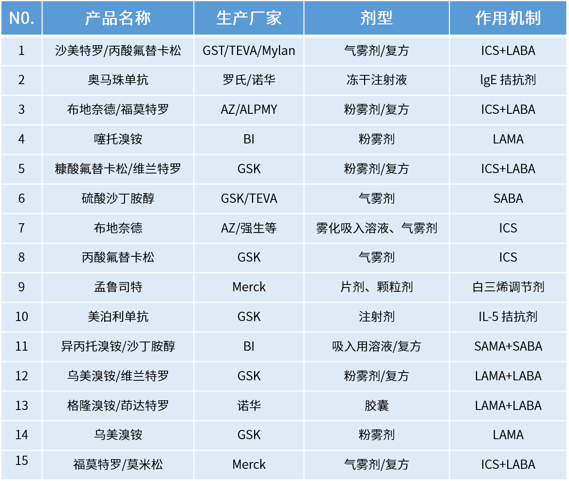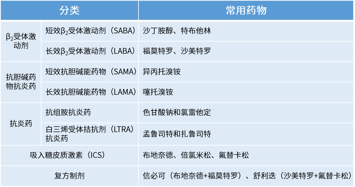 • 控制類藥物,即需要每天使用并長時(shí)間維持應(yīng)用的藥物,包括吸入性糖皮質(zhì)激素(ICS)、ICS/長效β2受體激動(dòng)劑(ICS/LABA)、全身性激素、白三烯調(diào)節(jié)劑(LTRA)、緩釋茶堿、抗IgE單克隆抗體等;