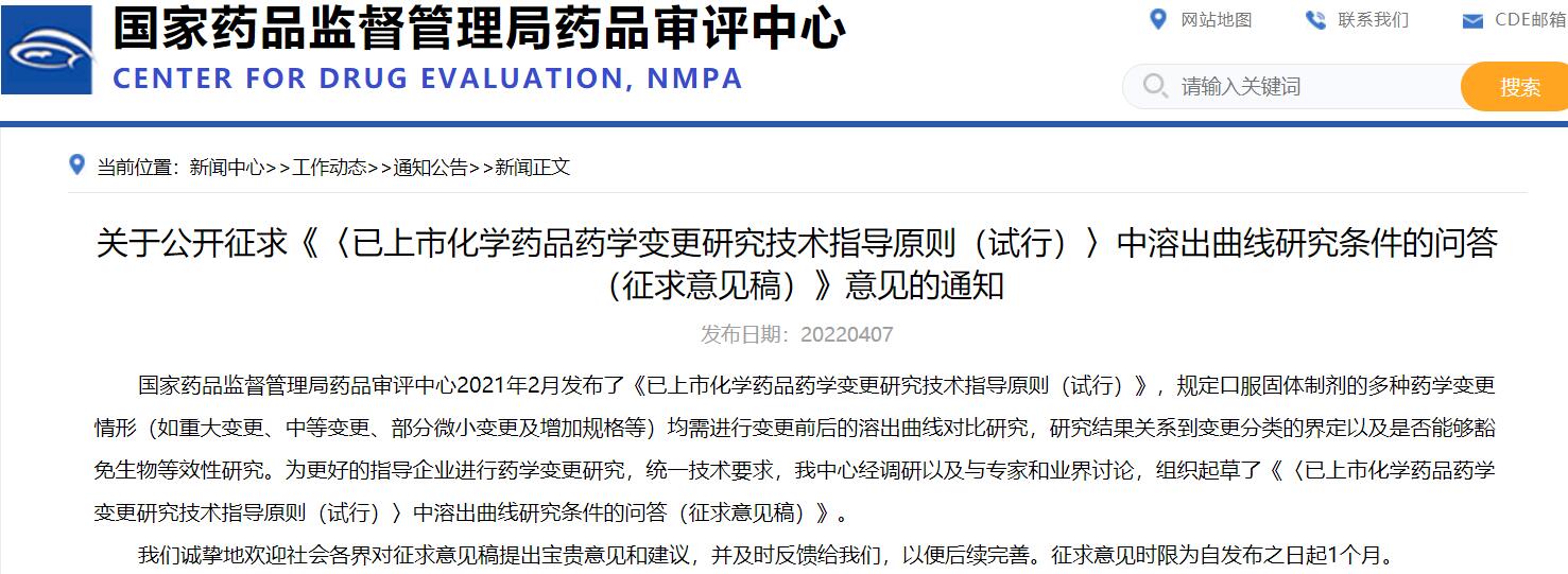 關(guān)于公開(kāi)征求《〈已上市化學(xué)藥品藥學(xué)變更研究技術(shù)指導(dǎo)原則(試行)〉中溶出曲線研究條件的問(wèn)答(征求意見(jiàn)稿)》意見(jiàn)的通知