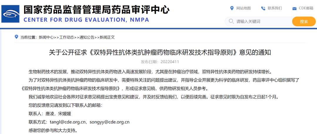 關(guān)于公開(kāi)征求《雙特異性抗體類(lèi)抗腫瘤藥物臨床研發(fā)技術(shù)指導(dǎo)原則》意見(jiàn)的通知