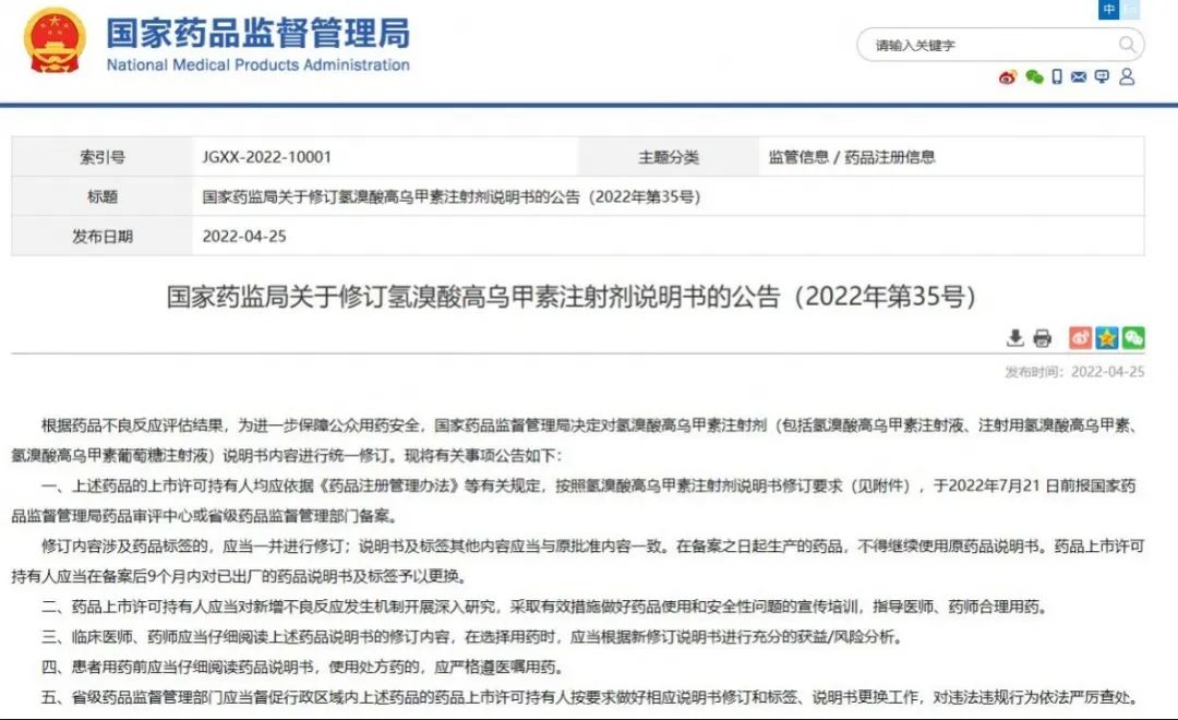 國家藥監(jiān)局關于修訂氫溴酸高烏甲素注射劑說明書的公告(2022年第35號)