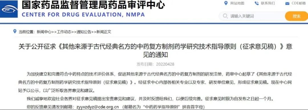 關于公開征求《其他來源于古代經(jīng)典名方的中藥復方制劑藥學研究技術指導原則(征求意見稿)》意見的通知