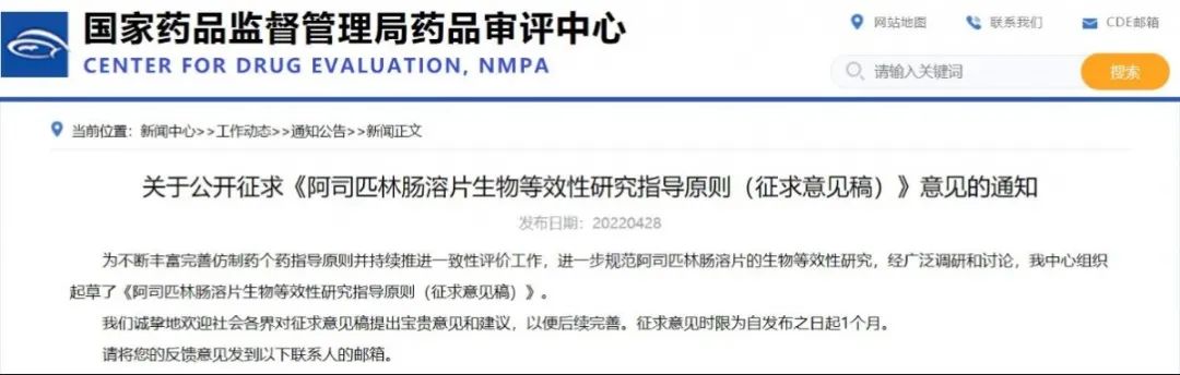 關于公開征求《阿司匹林腸溶片生物等效性研究指導原則(征求意見稿)》意見的通知