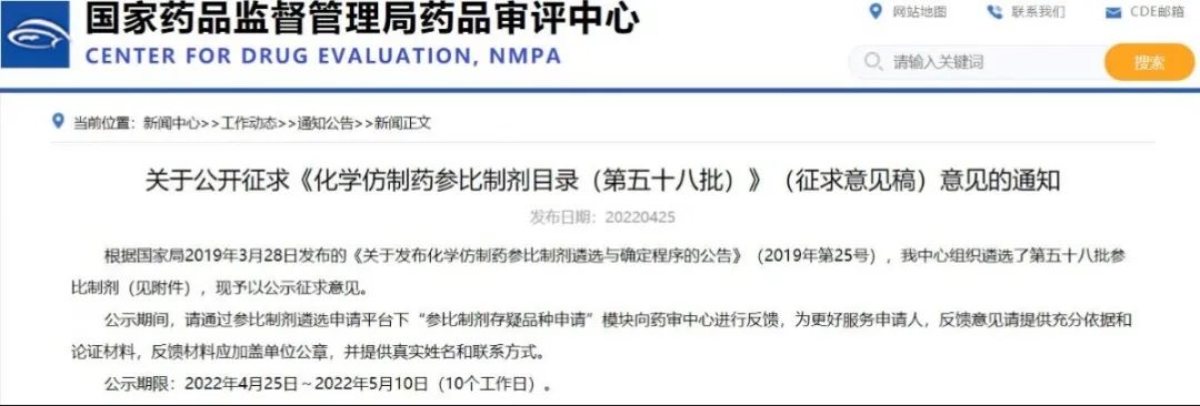 關于公開征求《化學仿制藥參比制劑目錄(第五十八批)》(征求意見稿)意見的通知