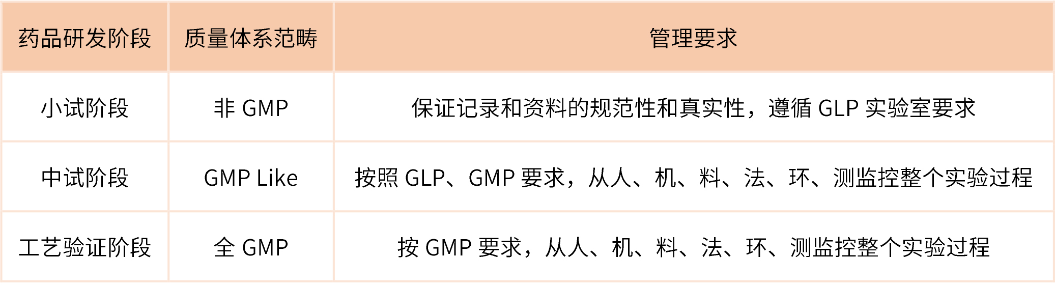 藥品的不同研發(fā)階段,對質(zhì)量體系控制的要求也不同。下表對藥品不同研發(fā)階段的質(zhì)量體系范疇和管理要求進(jìn)行簡述。