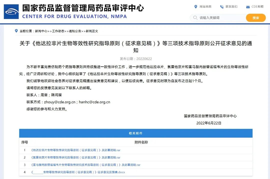 關(guān)于《他達拉非片生物等效性研究指導(dǎo)原則(征求意見稿)》等三項技術(shù)指導(dǎo)原則公開征求意見的通知